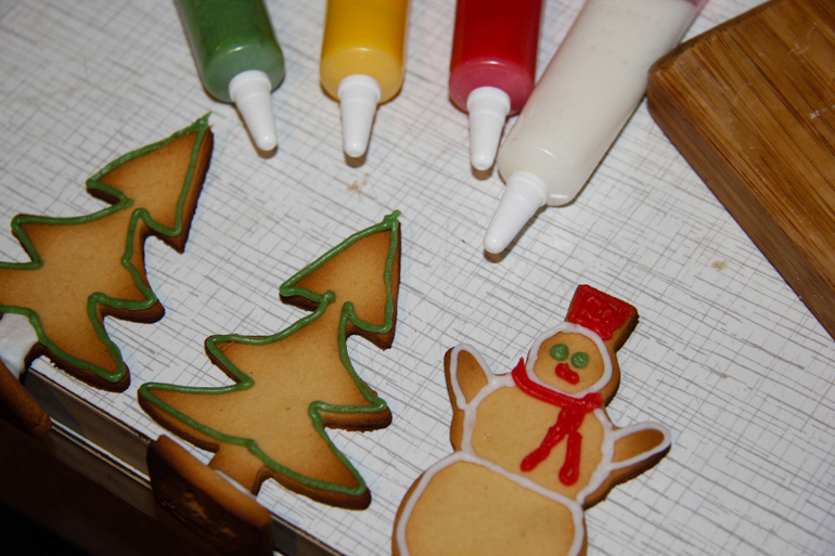Пока скрепленный домик подсыхал, мы установили на подставочки все остальные фигурки и декорировали их. Красить айсинг мне стало лень, и мы использовали готовые кондитерские карандаши с цветной глазурью.