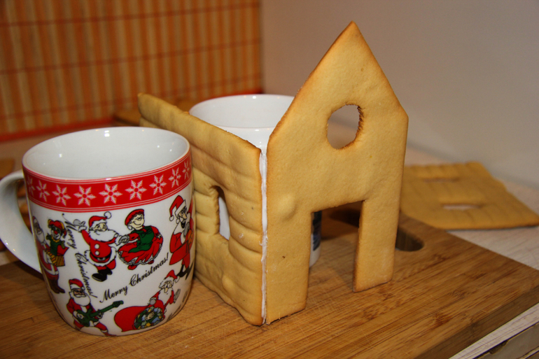 Далее можно действовать двумя способами: либо по-отдельности расписать детали домика, а затем их склеить, либо наоборот - сначала собрать всю конструкцию, а затем расписать. В любом случае самое главное при сборке - надежно фиксировать все элементы домика до полного высыхания глазури! Мы использовали для этого полкухни подручные материалы: чашки, кружки, палочки. Особое внимание нужно уделить закреплению крыши: без временной опоры она будет медленно, но верно сползать по застывающей глазури :)