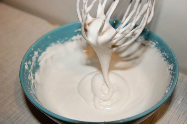В это время делали глазурь-айсинг для следующего этапа - сборки и украшения домика. Чтобы получить глазурь, взбили 1 яичный белок с 1 чайной ложкой лимонного сока до состояния мягкой пены, а затем постепенно ввели в массу 180-250 г сахарной пудры. Глазурь должна быть блестящая и достаточно густая, при поднимании венчика оставлять след горкой. Готовую глазурь нужно плотно закрыть пищевой пленкой и оставить на полчаса.
