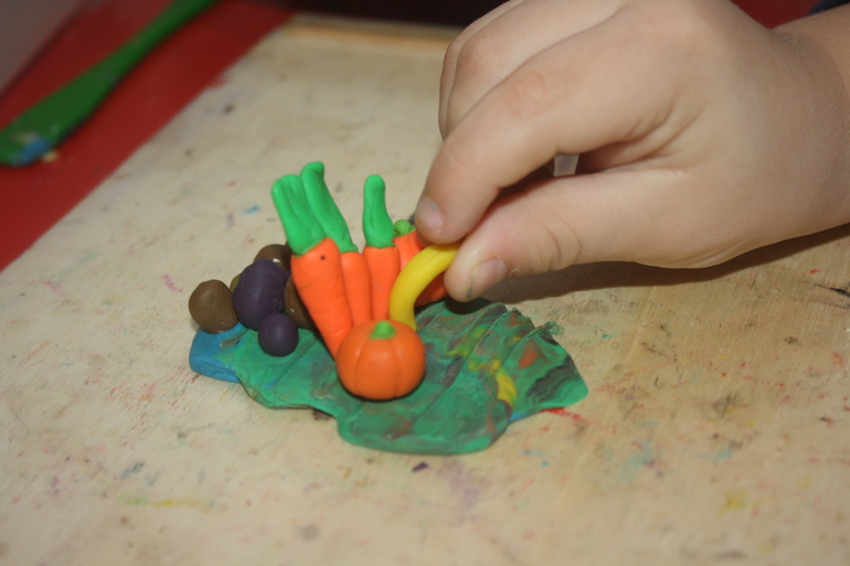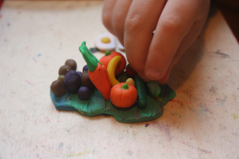 А тут буквально на днях достала я эту коробочку с глиной, детям пластилин выдала и давай лепить. Налепила немного, но этого хватило, чтобы Дима занялся серьезно не рыбной темой. а огородно-овощной )