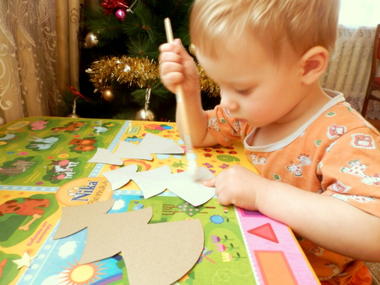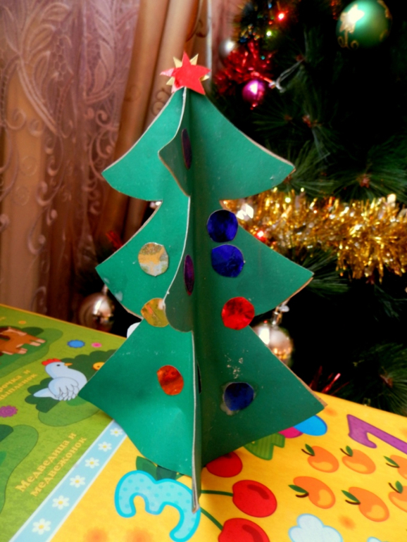 Заготовки я сделала сама, а потом сыном все обмазали клеем и склеили. Подарим нашу елочку бабушке.
