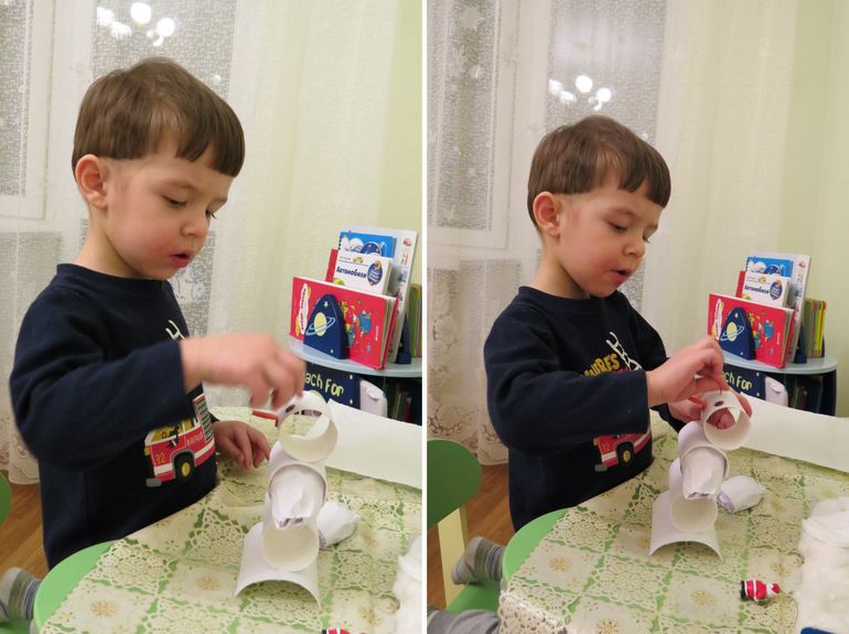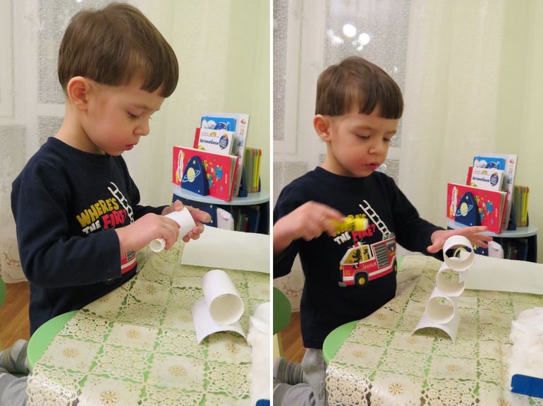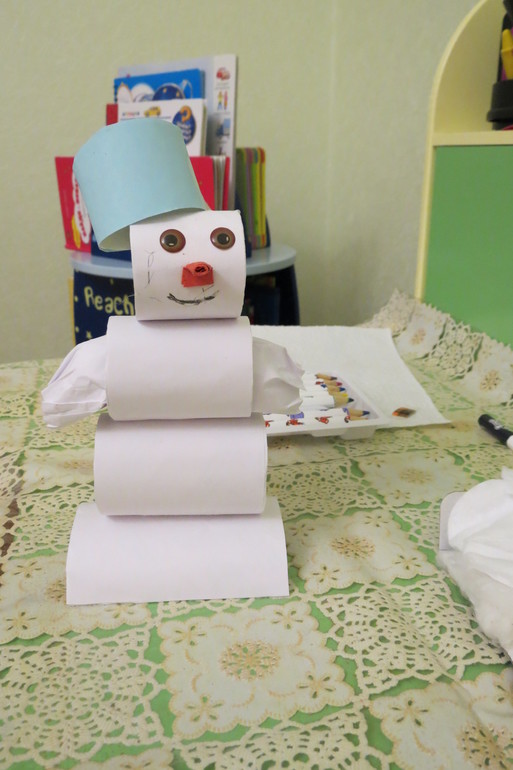 Снеговик-почтовик. Все заготовки я сделала заранее, оставив Лёне лишь посильное для его возраста и усидчивости творчество. Заготовки - это три рулончика разной длины, обклеенные белой бумагой, подставка из половины рулончика, два комка из бумаги для ручек и ведро на голову. По времени минут 10. Дальше творил Лёня, я лишь направляла и удерживала поделку от падения.