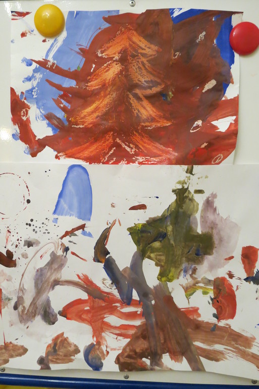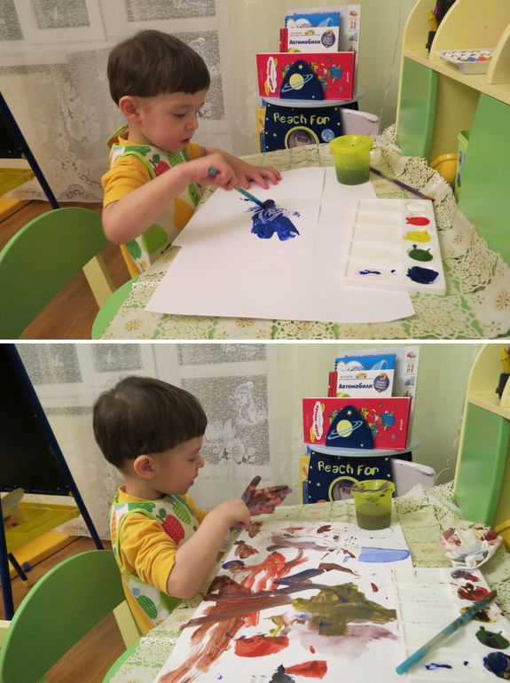 По окончании творчества я слегка промокнула излишки краски салфеткой. Вот что получилось. (На втором листе Лёня решил нарисовать маму и папу. Где кто, остается только догадываться.)