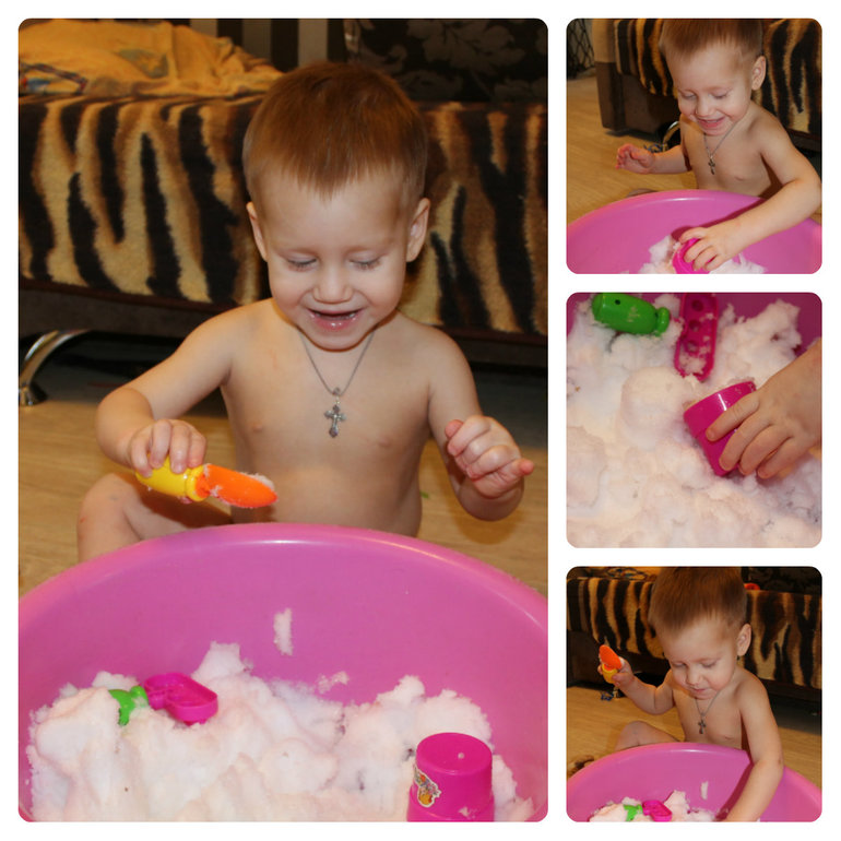 Пока Вадим был в садике развлекала Глеба. Этим конечно мы и на улице занимаемся, но там не так приятно сидеть на ветру в мороз, еще и снег не липкий. А дома от восторга визжал, играл пока весь тазик не расстаял. Минут через 15 снег стал поддатливым как песок, даже мелкие фигурки из него лепили.