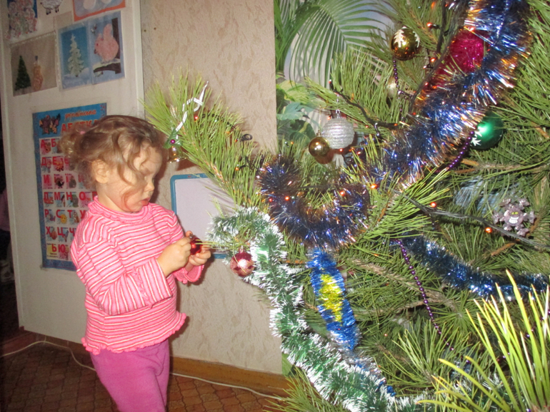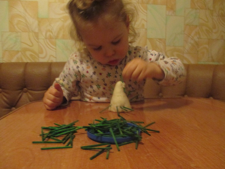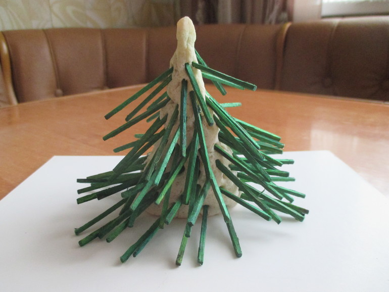Малышка моя, как и большинство детей, любит возиться с мелкими предметами и солёным тестом. Так возникла идея сделать ёлочку из крашенных пищевым красителем спичек, за основу взяли конус из солёного теста. Простенько, но результатом дитя довольно и я тоже. Делала практически всё сама.