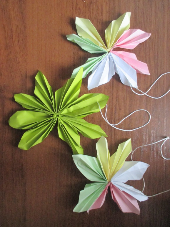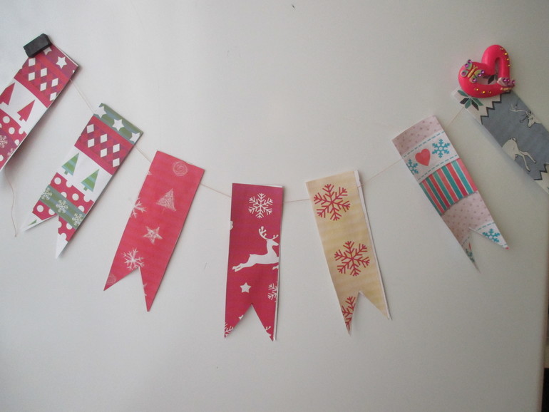 Двухсторонняя гирлянда из флажков. В ходе работы необходимо сначала найти два одинаковых флажка, а потом склеить их протянув между ними нитку.