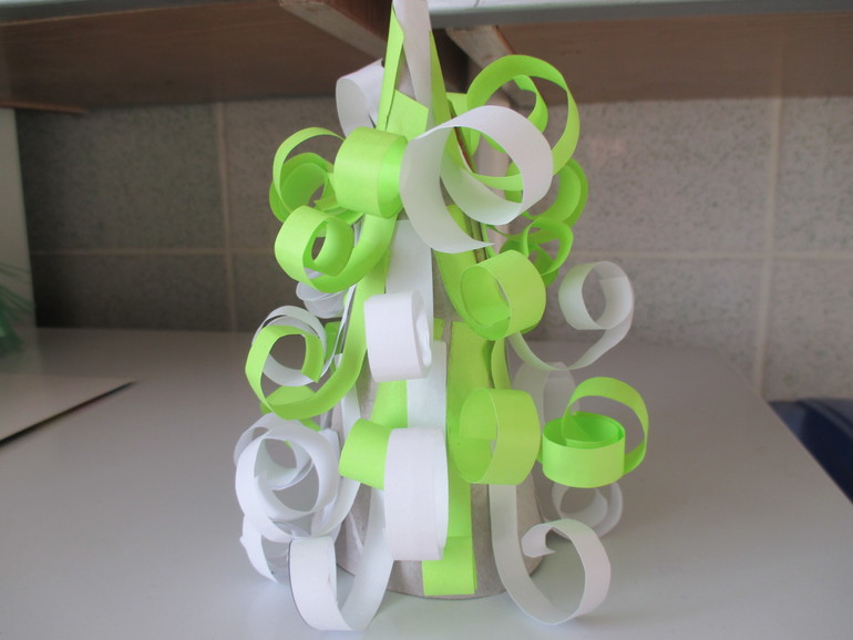 Мне нравится показывать ребёнку как можно использовать простые бытовые предметы (бросовый материал) в поделках. Это хорошо развивает воображение, фантазию, умение находить выход из ситуации нестандартными решениями. Таким образом, у нас получилась ёлка из полосочек от пластиковой бутылки клеинные суперклеем на картонную основу.