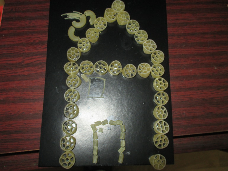 Домик из макарон. Хотела, чтобы доченька приклеила вату (снег), но она сказала, что нет снега на улице, поэтому доделаем поделку когда выпадет снег.
