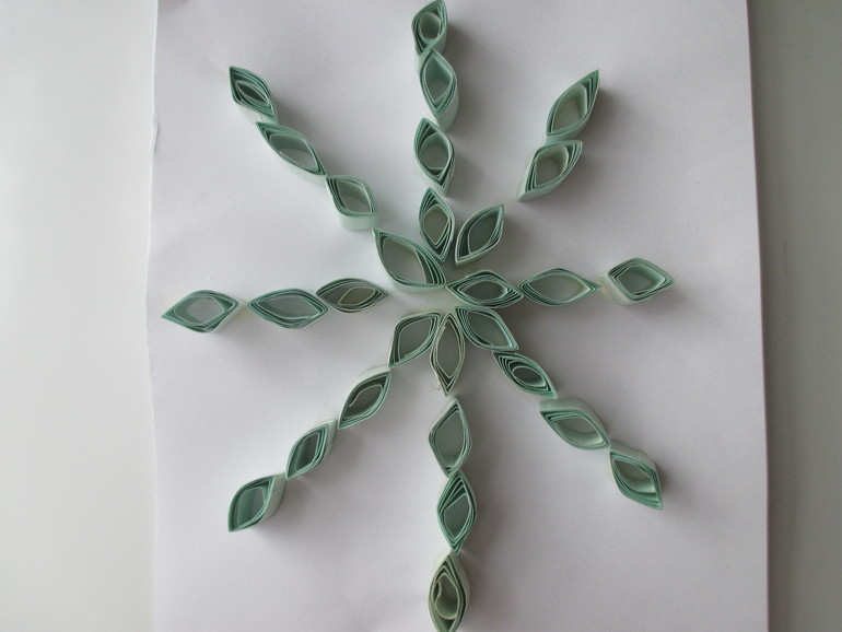 Снежинка в технике квиллинг. Накручивал полосочки конечно старший, на вот выкладывать на намазанный контур детали доченьке очень понравилось.