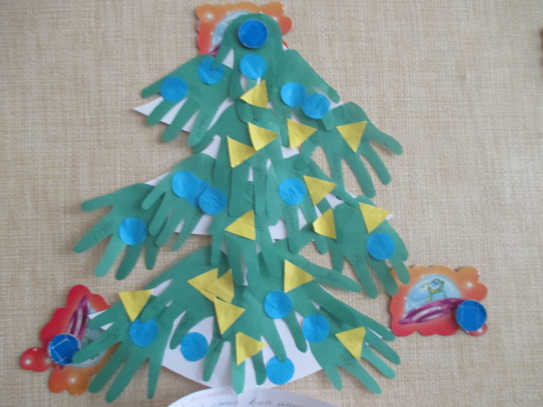 Еще на этой неделе у доченьки была первая коллективная работа в детском саду. Ёлка из ладошек украшенные кружочками и треугольничками. Наша ладошка внизу по центру.