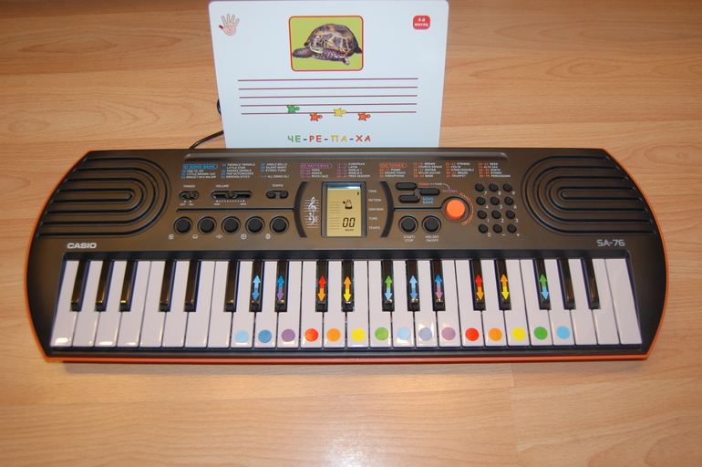 11)Синтезатор CASIO SA-76 - одно из последних приобретений. Покупали тут. Уже всей семьей играем на нем, хотя ни у кого нет музыкального образования. А мне как вы помните, вообще "медведь на ухо наступил". Но мы расклеили кружочки из набора bimbasket.ru и радостно играем по карточкам.
