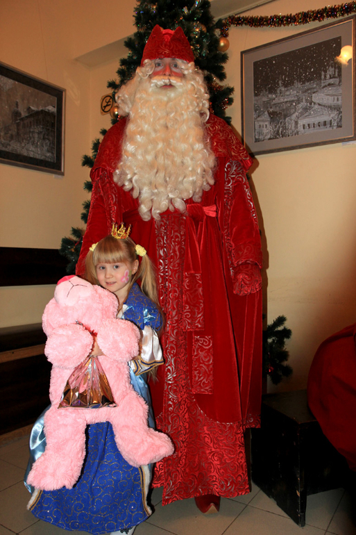 После интерактивной программы с дедом и Снегурочкой начался спектакль "Щелкунчик". ОЧень-очень понравилось! Актеры работали от души, эмоционально и задорно, было очень интересно. Моя дочка знакома с сюжетом "Щелкунчика" - мы читали книгу, в саду утренник был тоже с Щелкунчиком, аудио-спектакль дочка слушает без конца, воображая себя Мари и бросая от души свои домашние тапки в "мышиного короля" )))) поэтому и спектакль ей был интересен. но в целом в зале стоял некоторый гул, многие дети отвлекались от сюжета и разговаривали. После спектакля все дети пошли получать подарки. Их раздавал у елочки сам Дед Мороз! там же с ним можно было и сфотографироваться )) Подарок удивил! это был небольшой пакетик с конфетами (совсем чуть-чуть, граммов 100-150) и огромный мягкий медведь, медведи были двух цветов - бежевые и розовые. вот только Дед был другой, не тот, что со Снегурочкой выходил в начале. А мы ему подарки принесли - самодельные свечи с новогодним дизайном, Саша подарила ему обе свечи, велела Снегурочке передать )))