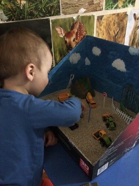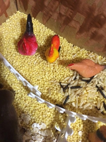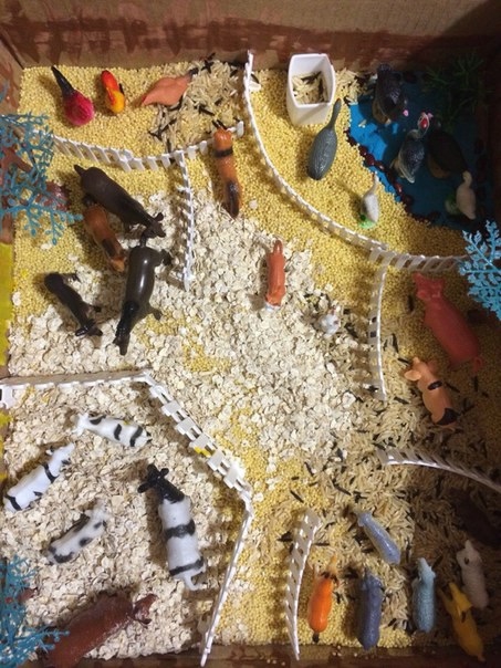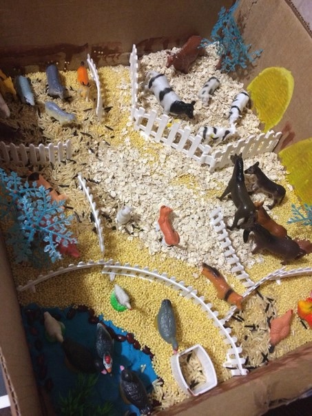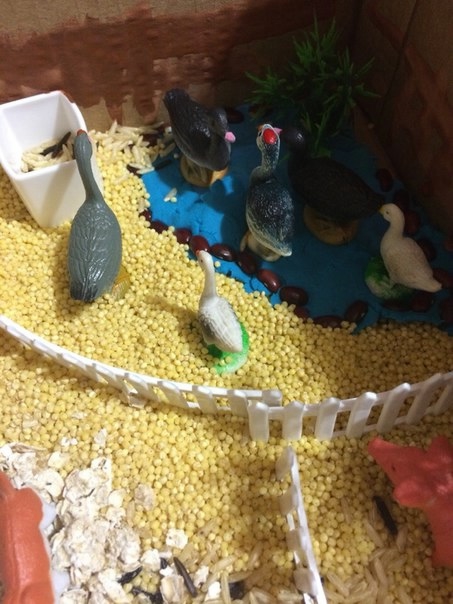 коробка, наполнитель(пшено, геркулес, рис,озеро из пластелина),