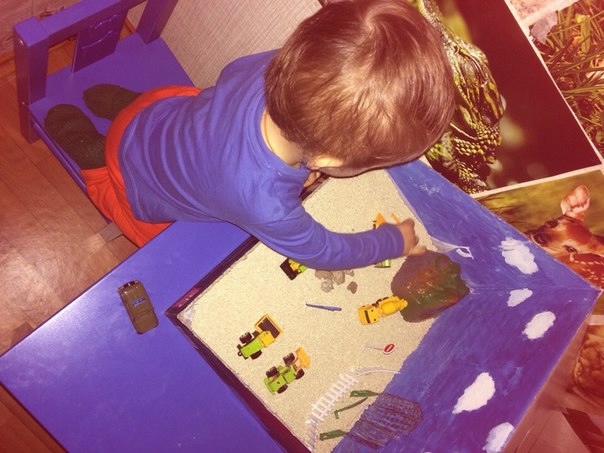 коробка, кошачий наполнитель, машинки, камни и заборчик с елочками из отечественного конструктора
