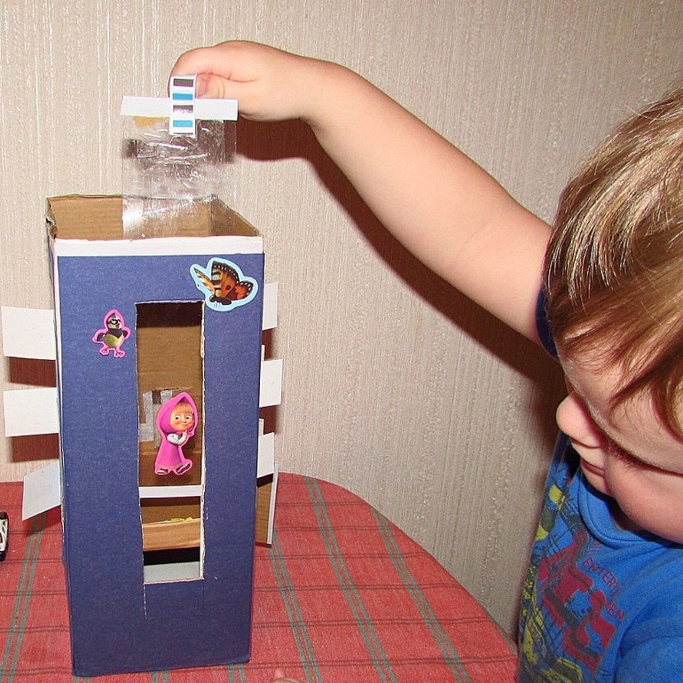 Ну как вы лифт сделали? Я тоже делаю домики из пакетов из под молока, с двумя этажами, дверями и проч.