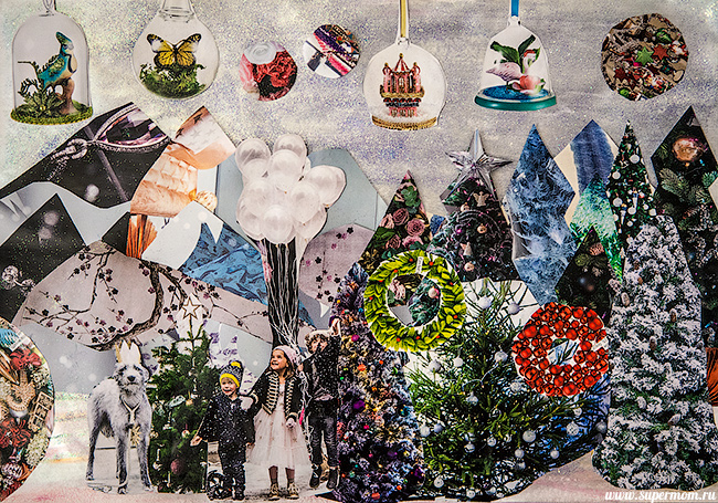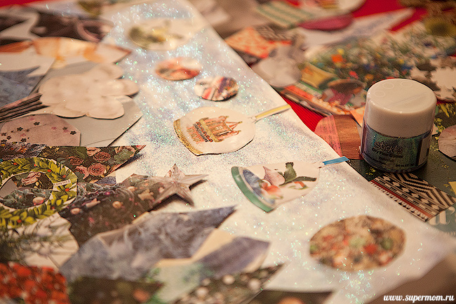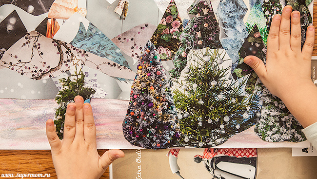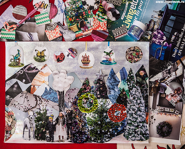 Потом я распотрошила глянцевый журнал, грубо нарезала фигурок для будущего колажа, и мы принялись клеить.