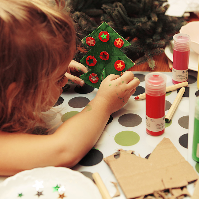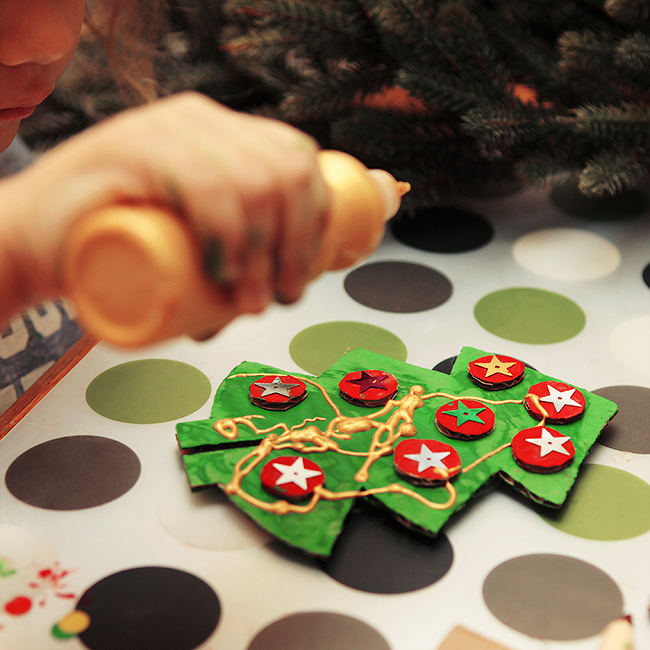 Сначала мы сделали елки. Я вырезала, Алиса раскрасила, все приклеила сама, украсила.