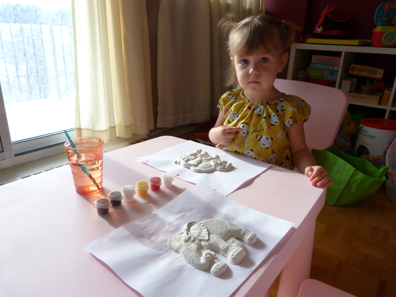В принципе стынут они не долго, но мы делали их вечером, поэтому оставили сохнуть до утра. А утром приступили к раскрашиванию. Ева выбрала себе слониху со слоненком, а мне достался папа-слон. Мы поговорили с дочкой какого цвета в природе слоны, но она сказала, что серого она не хочет, а хочет разноцветного. Так что у дочки слоны сказочные. Наверное родственники Элмера (хотя мы такую книгу с дочкой еще не читали).