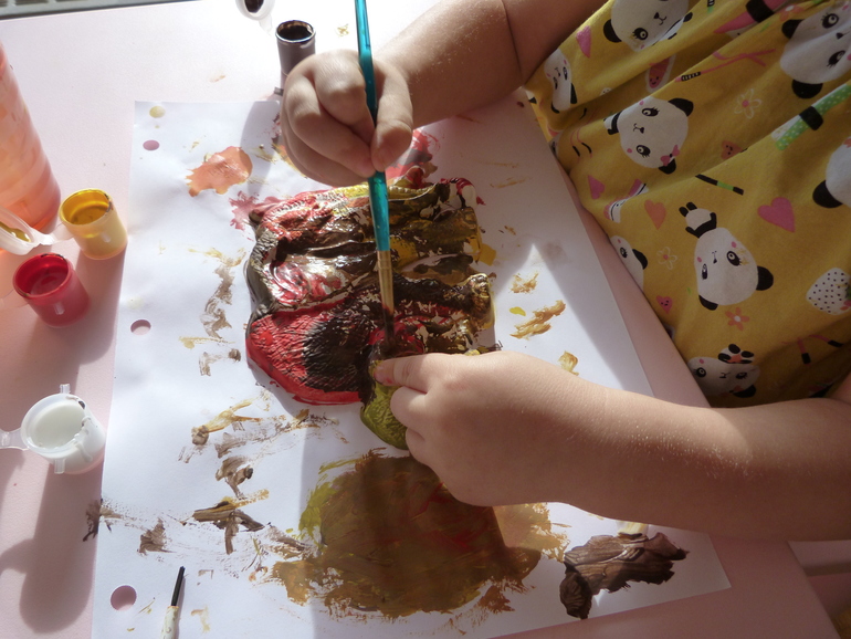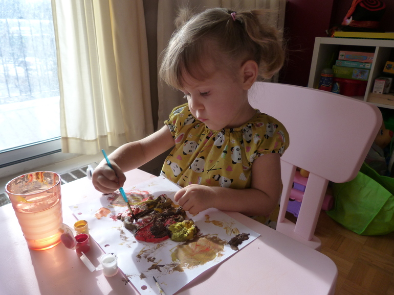 Процесс очень увлек Еву. Затем я еще показала, как можно смешивать цвета на бумаге, чтобы получались разные оттенки. Дочке это очень понравилось, даже пришлось напоминать, что слоника то она не до раскрашивала.