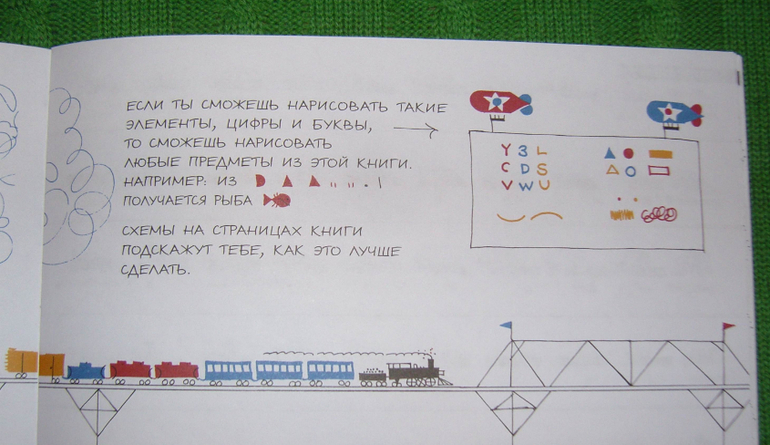 В книге очень много пошаговых инструкций по рисованию всякой всячины - растений, животных, людей , разных зданий, машин (грузовых и легковых) , поездов, самолетов (и других летательных аппаратах) , кораблей и других всяких- разных предметов!