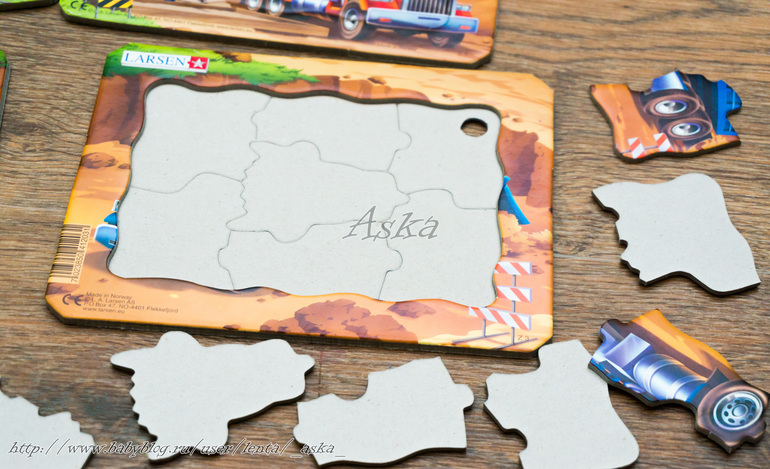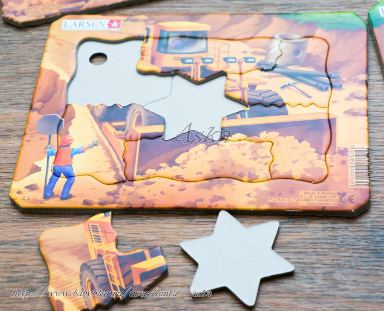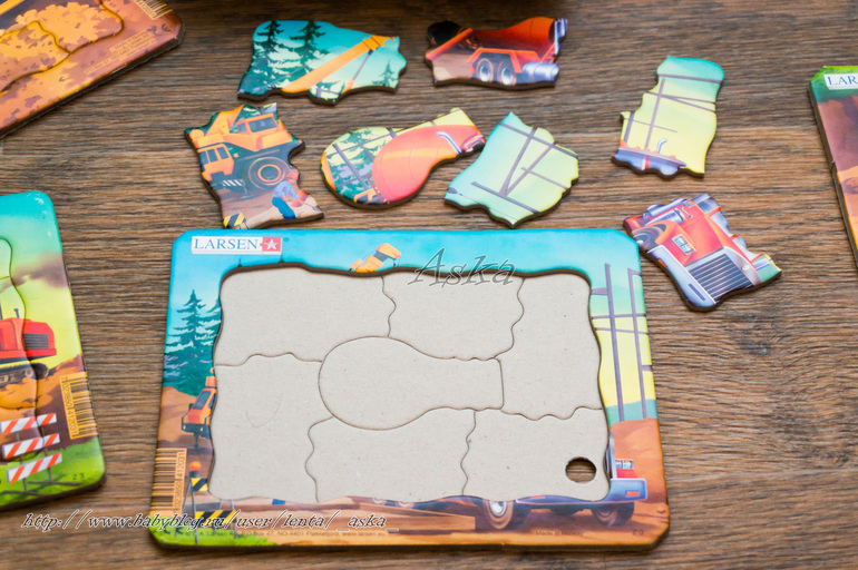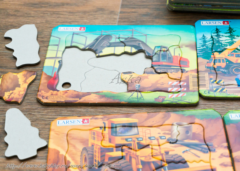 Ларсены для начинающих очень удобные - есть подложка и подсказки в виде контуров деталей. И сами детали плотные, немного пухленькие, собираются пазлы довольно легко.