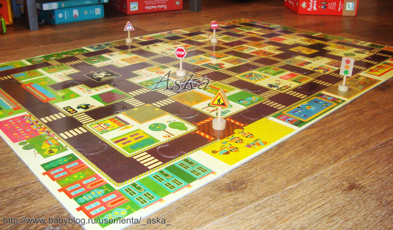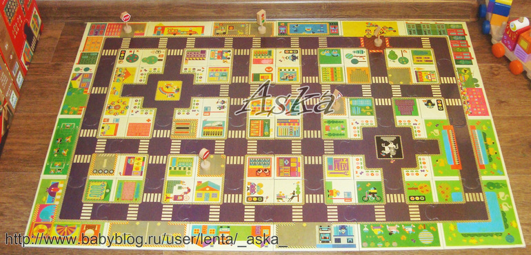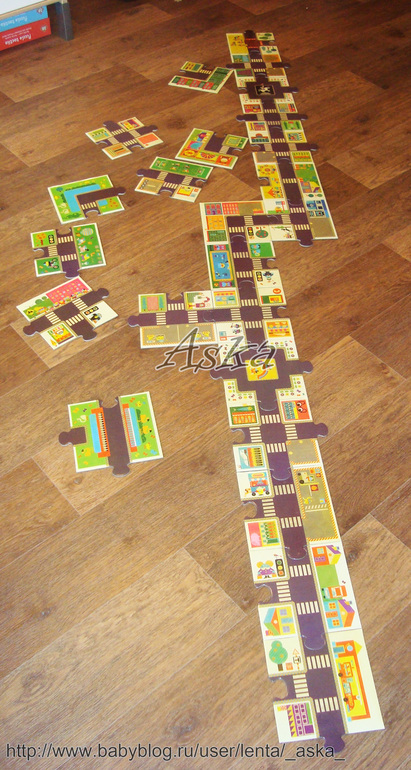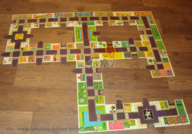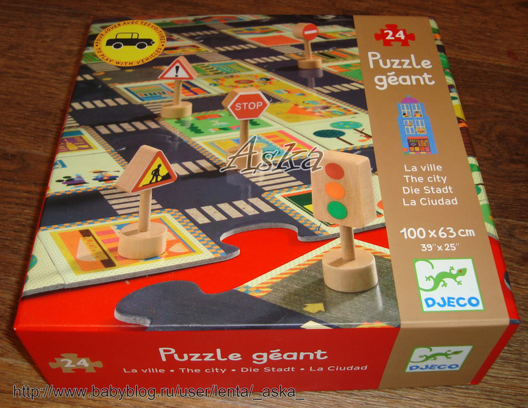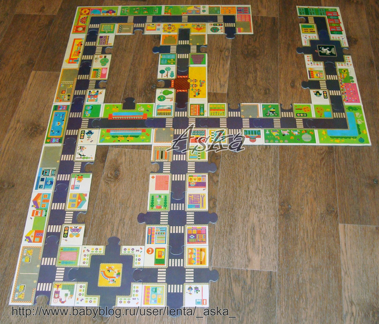 Размер пазла 100*63 см, в набор входят 24 детали и 5 дорожных знаков. Размер одной детали 16,5*16,5 см плюс "хвостики".