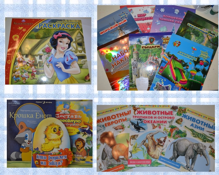 Книги, раскраски, и конечно альбомы наклеек