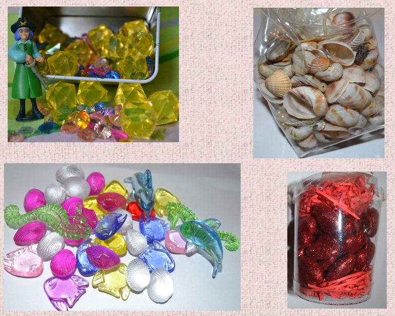 Покупаю там камушки разной формы, пенопластовые фигуры, ракушки, мерные ложечки, формы для сортировки