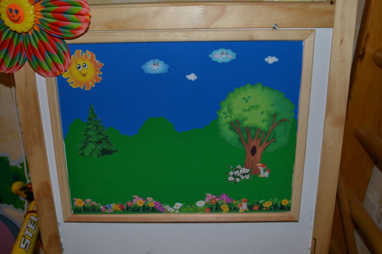 Травку, деревья, солнце распечатала на бумаге клейкой, вырезала и наклеила.
