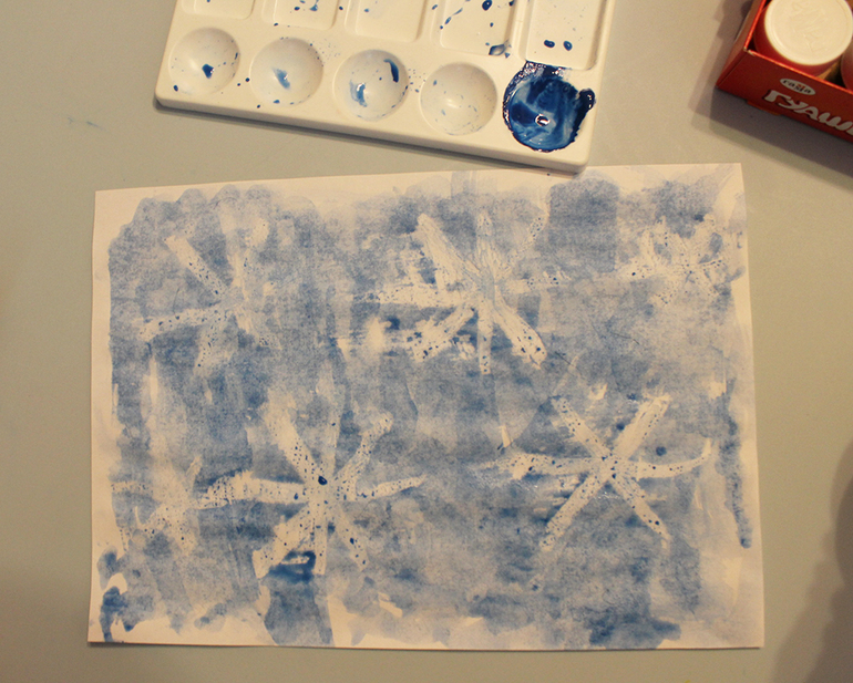 На листке белой бумаги нарисуйте любой узор свечой (сильно надавливая, по некоторым снежинкам видно, что не особо четкие получились именно из-за этого).