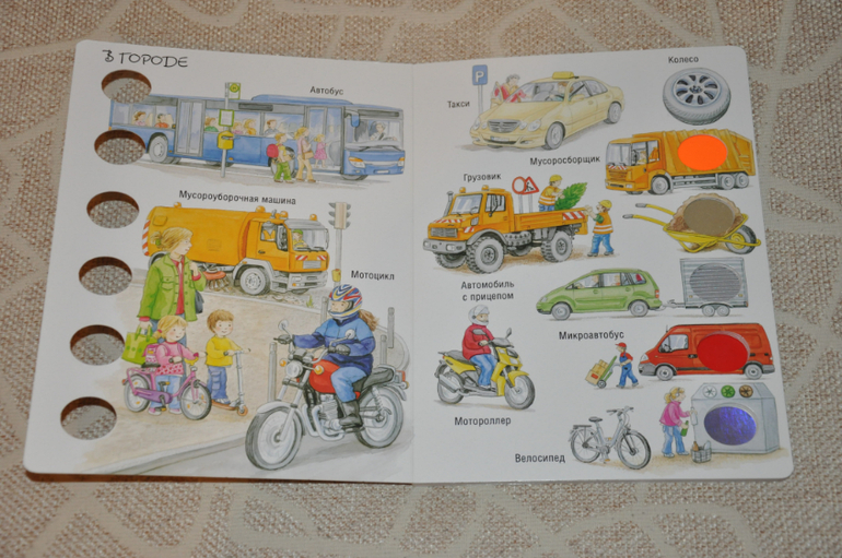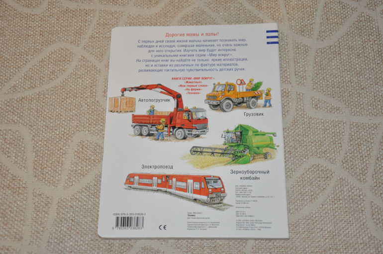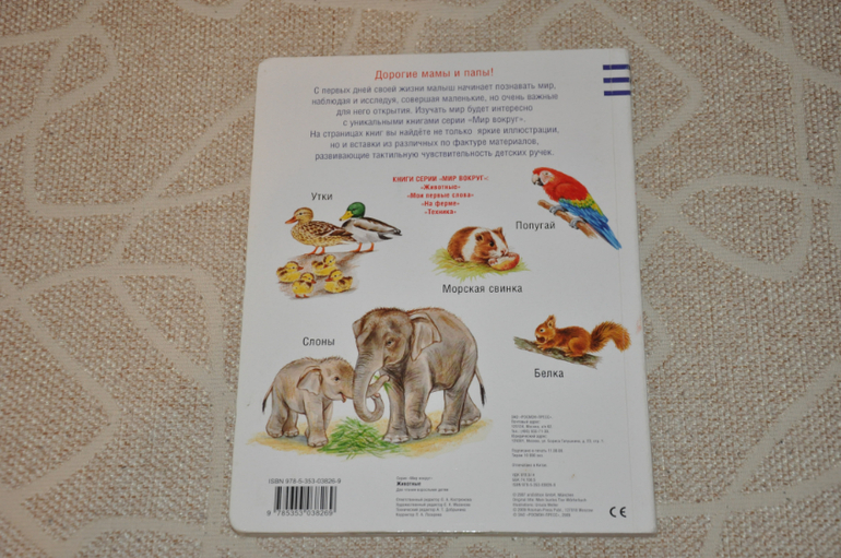 А вот книги из серии "Мир вокруг", о которых мы расскажем дальше, изучались нами как раз с полугода. Все они выполнены из очень плотного картона, содержат кучу полезной информации по теме, в них очень яркие рисунки и в каждой есть шесть тактильных элементов для малышей.