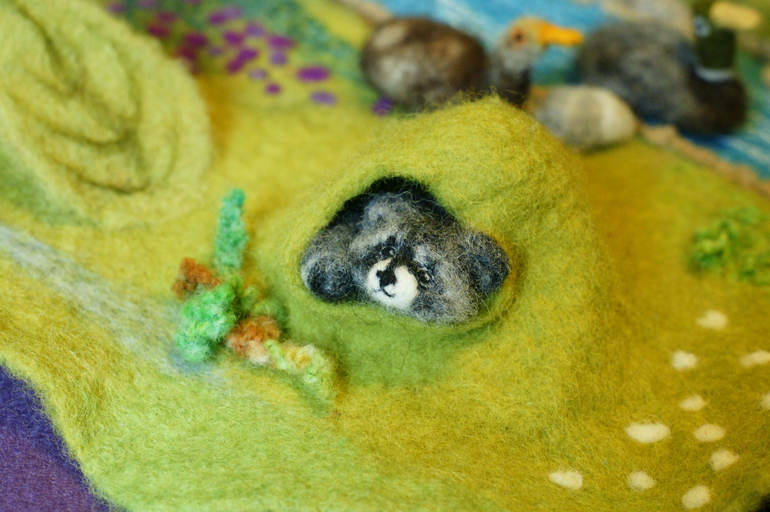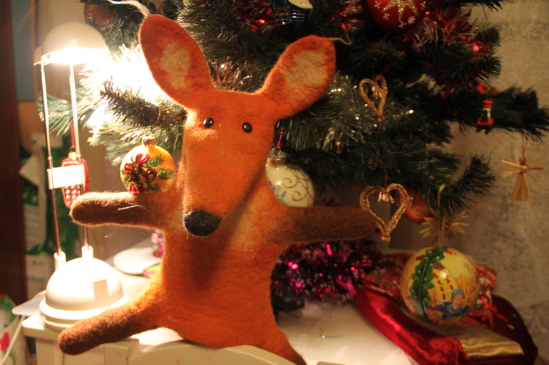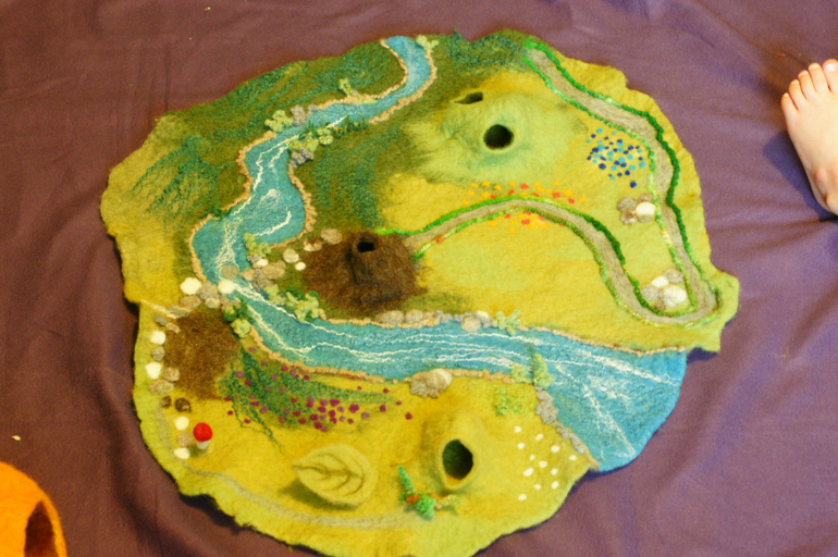 А вот и подарок Деда Мороза. Одна замечательная девушка сделала для нас такой вот коврик. У Егора страть - норки, он и сам их себе строит и я вечно нахожу в обшивке дивана жирафа, например. Это норка у него такая. У нас и обувь - не обувь, а всё сплошные норы. Теперь добавилась "норообильная" полянка с совершенно потрясающими животными.