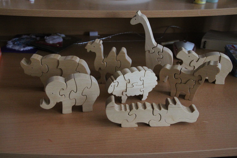 Деревянные пазлы ручной работы. Заказывала на Ярмарке Мастеров. Сначала заказала самые простые, сейчас, конечно, они собираются маленькими ручками уже моментом. Если все детальки перемешать, то, порой, и взрослый не сразу сообразит, где тут серединка слона, а где носорога. И, конечно же, ручная работа... Увидила аналог в "Леонардо", но такой, фабричный, не то, совсем не то...