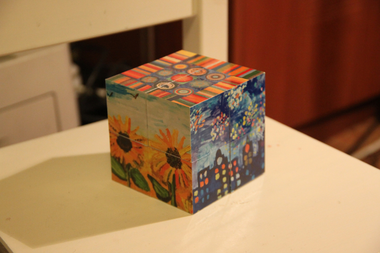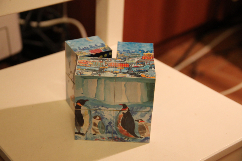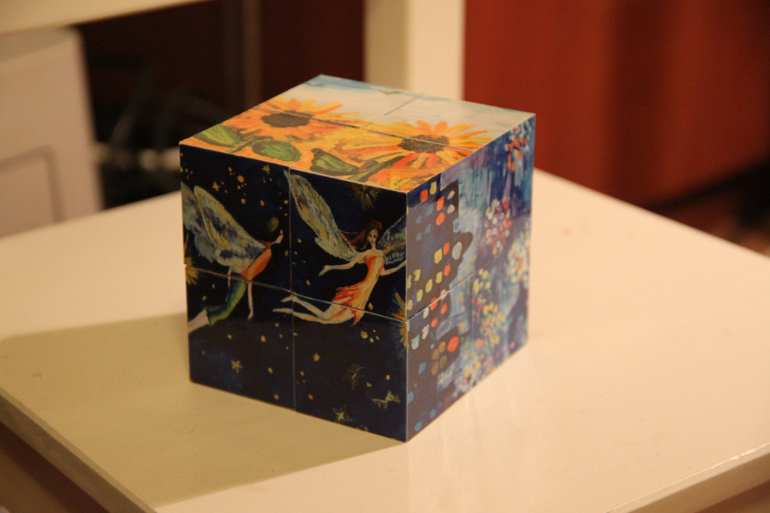 Там же я нашла и этот замечательный кубик-трансформер, куда поместилось 12 картин! Да не простых, а нарисованных детьми с отклонениями в развитии, картины прекрасные, натоящие художники эти ребята. Мы очень любим рассматривать его, обсуждать все картинки, да и конструкция завораживает даже взрослых, так он здорово ракладывается!