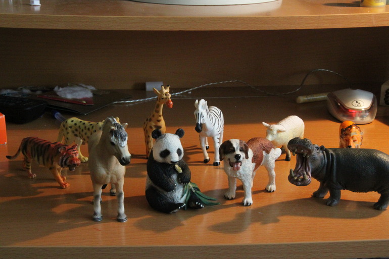 Фигурки животных. Меня в детстве "не цепляли" натуралистичные изображения животных, особенно не мягкие, сестру - тоже. Но Егор, по ходу, юный натуралист. Звери - наше всё. Два дедушки (оба в прошлом автоспортсмены) не опнимают, почему ребёнок не играет в машинки?! Но коробка с машинками стоит в углочке, а по всем карманам - зоопарк. Коллекция небольшая, но, честно говоря, её хватает пока.