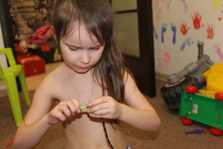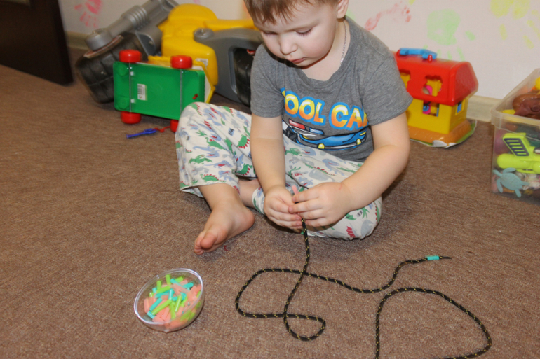 У запасливой хозяйки каких только вещиц в доме не найдется. С лето осталась огромная пачка соломинок, обрезали их на разные по размеру частички, вытащили из папиных ботинок шнурки и делали змеек.