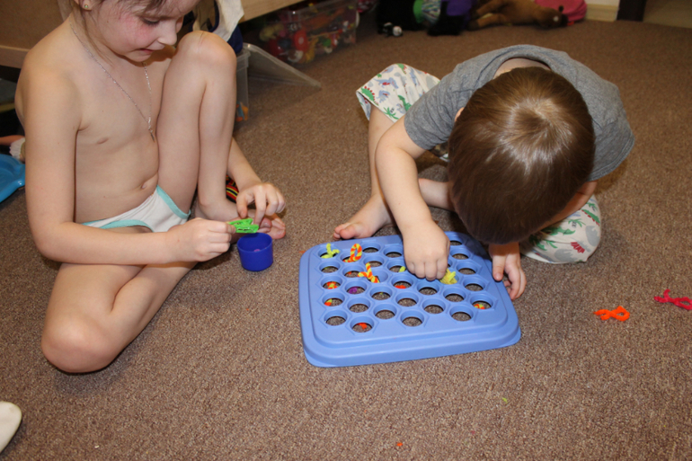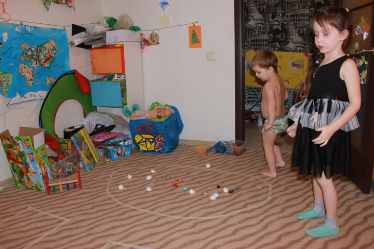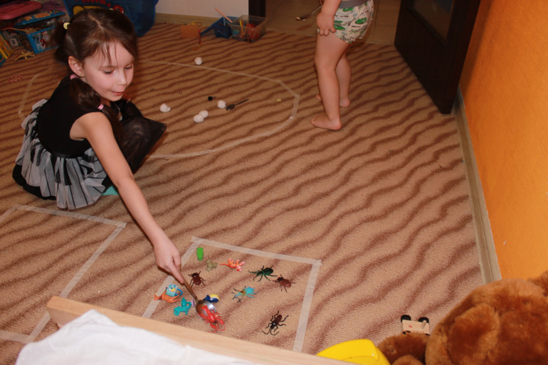 В эту игру легко включаются и изучение/повторение цветов,размеров,свойств предметов. Большие рыбки складывались в большое ведерко, маленькие в маленькое. Или например желтых рыб можно было ловить лишь желтыми "удочками" и пр.