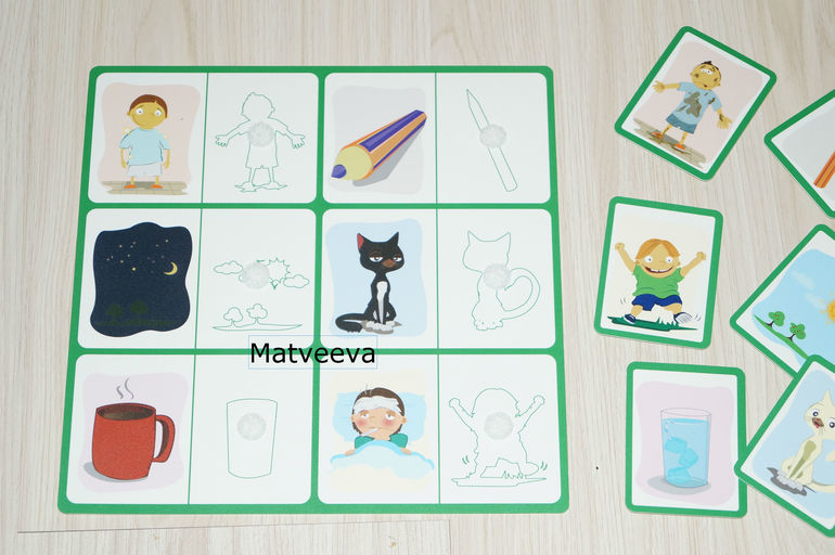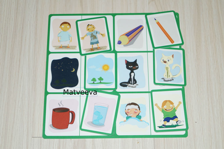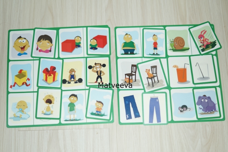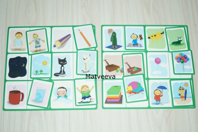 покажу карточку поближе))) особенность этого лото, что нужно подобрать противоположности) чистый-грязный, толстый-тонкий, день-ночь, черный-белый, холодный-горячий, больной-здоровый