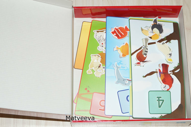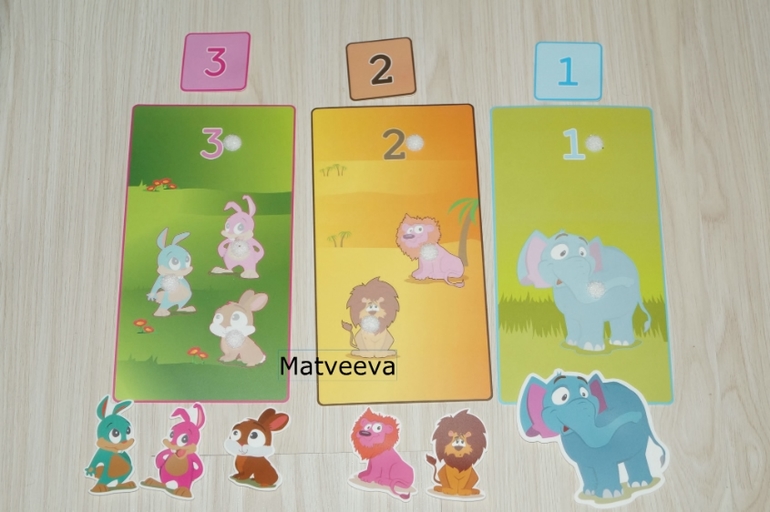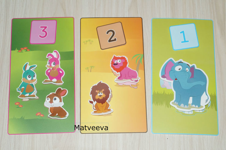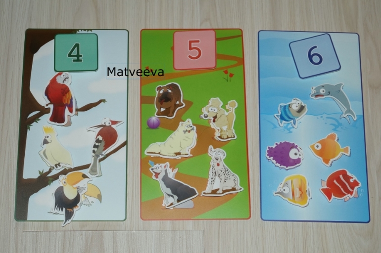 А этот набор для обучения счету) Задача ребенка прилепить на карточку животных, посчитать и подобрать нужную цифру)