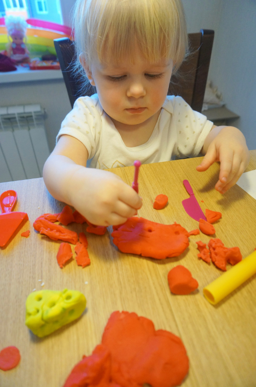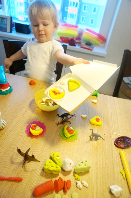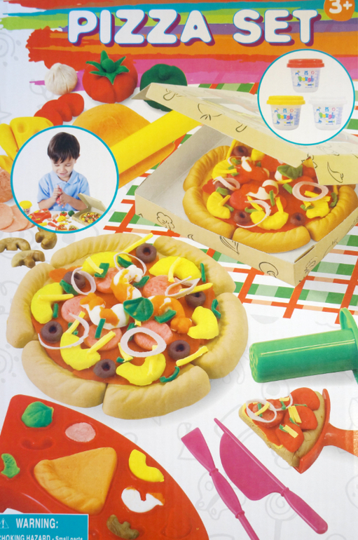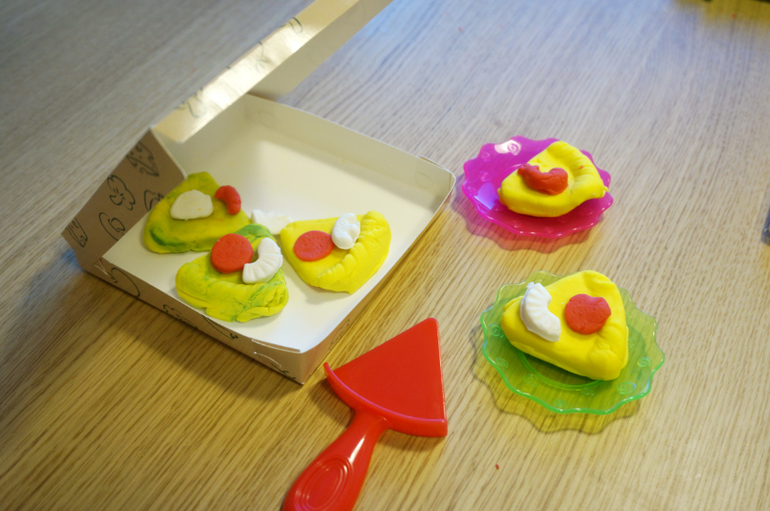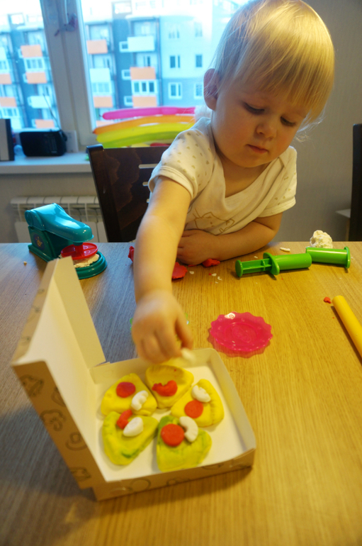Развивающие игрушки (пазлы, вкладыши, конструкторы, мозаики)Я периодически пишу о наших пластилиновых творениях и игровых наборах, на этот раз мы пекли пиццу.Набор недорогой и незамысловатый, но в нем есть все нужные элементы для создания теста и начинки, скалка, несколько видов прорезывателей и даже мини коробочка для упаковки получившегося изделия. Самого пластилина в наборе очень мало, поэтому советую, докупаться Play Doh. Маша сильно увлеклась процессом, поэтому мы потом еще и сыра с дырками налепили, и колбаску порезали и моцарелку скатали шариками, и чесночок для остроты, да еще и друзей угостили вкуснятиной!
