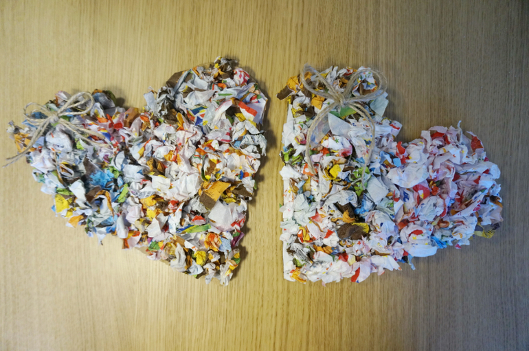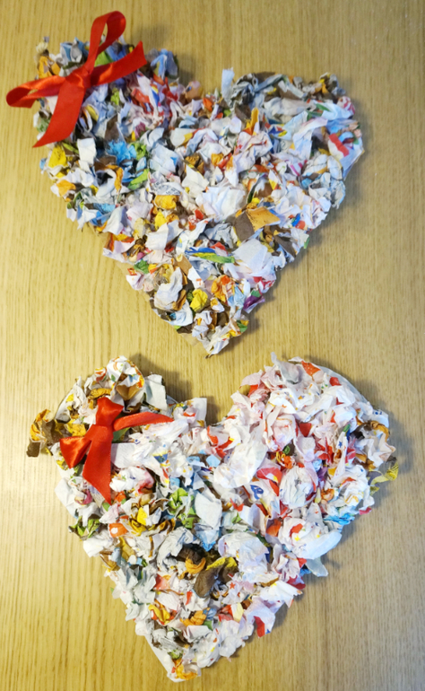 1е сердечко выложили арбузными и тыквенными семечками, покрыли лаком для ногтей2е сердечко раскрашивали креповой бумагой, для этого нарезали креповую бумагу на небольшие кусочки, альбомный лист смочили с помощью кисти, на мокрый лист выложили цветные кусочки, дали высохнуть, а потом убрали нарезанные бумажки, краска остается на альбомном листе.