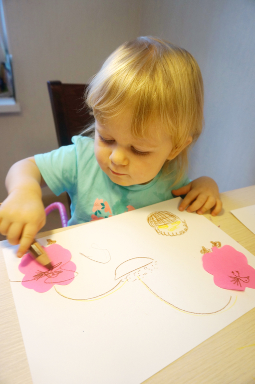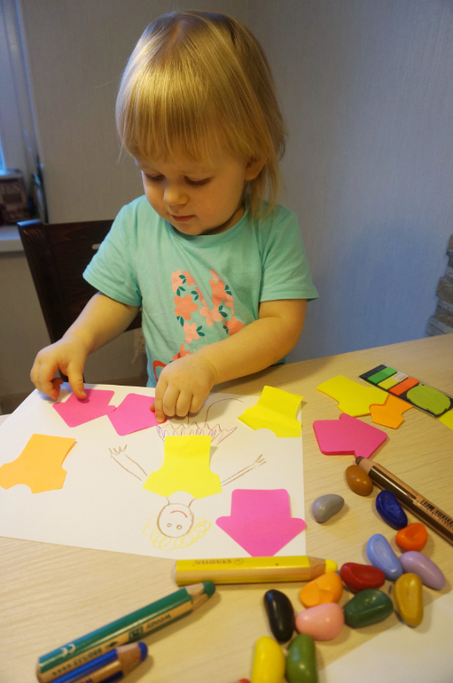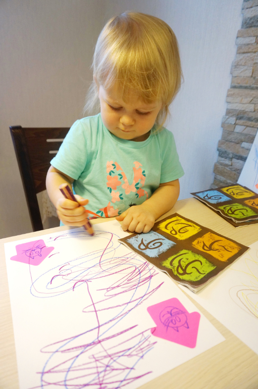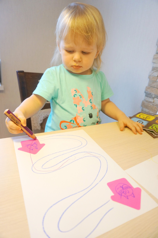 Развивающие игрушки (пазлы, вкладыши, конструкторы, мозаики)В последнее время я больше внимания уделяю постановке линии в Машином рисовании. Становится важным не факт творчества или карандаш в руке, а что и как она им собирается делать. Между делом быстро рисую ей пару примитивных лабиринтов, по которым она пытается сама проводить линию, чтобы поезд доехал в нужное место или друзья пришли к друг другу в гости. Такие рисовалки хорошо дополнились игрой со стикерами и даже пластилином, обо всем по чуть-чуть ниже...