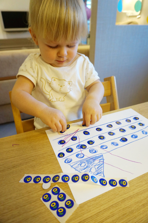 Стикеры из гипермаркета, мы не собираем фишки по акциям, а тут взяли и нашли им применение. Я рисовала кружочки, а Маша на них наклеивала стикеры.
