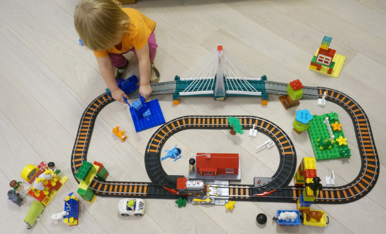 Игры и игрушки от 0 до 99 (Про игры и игрушки которые подойдут и большим и маленьким)То, что Маша обожает поезда - это неоспоримый факт, о котором я писала в разных постах. За героически перенесенный переезд из одной квартиры в другую, папа одарил ее В моем представлении, она должна была быть деревянной и ручной, но она на батарейках, пыхтит и катает всех Машиных друзей. Еще раз делаю вывод о том, что наши с детьми представления о классной игрушке порой сильно расходятся. Плюсы этой дороги в том, что можно переводить стрелку и поезд изменит курс на малый круг, можно его приостановить, и тогда будет крутиться вертолет на станции, есть дорожные знаки и небольшие украшения, но нам этого мало, поэтому пейзажи обрастают конструкциями Лего.Из минусов отмечу невозможность выключить звук паровоза, а он реально очень громкий, но дочь это приводит в восторг!