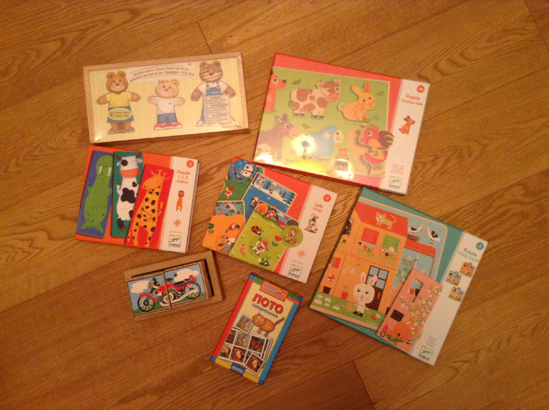 Далее много разных деревяшек развивашек от djeco и немного melissa&doug.очень уж нравится мне обе эти фирмы,качество очень хорошее,все интересное;единственное но у Melissa&doug рисунок наклеен! Будьте внимательны,тк для некоторых это принципиально.меня лично все устраивает,попортился рисунок только на одном пазле вкладыше(которые из тактильной серии) и то на одном жирафе,так сын его часами жевал.