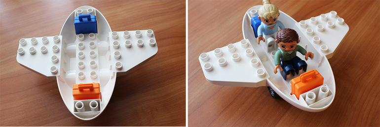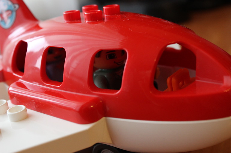 Я покажу только самолет, но в наборе есть все, что показано на коробке, т.е самолет, автомобиль, ящик, 2 чемодана оранжевых (у меня на фото один синий из другого набора). шланг и кубики для строительства. Стоил 1299 руб+ скидка по карте. В общем цена адекватная для такого набора.