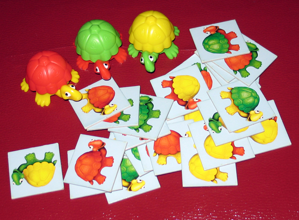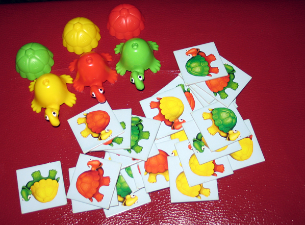 Мы игру упростили, подстроили под себя и слегка переделали правила. Мы не меняем панцири черепахам после каждого хода игрока. Просто в начале игры меняем панцири черепашкам и потом, переворачивая по очереди карточки, ищем их. Кто нашел больше, тот победил.