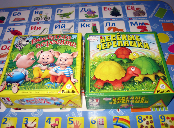 Одна из них называется "Весёлые черепашки", а вторая "Весёлые поросята". Кстати, вторая игра появилась у нас две недели назад, так что не обращайте внимание на коробку, это младший сыночек проверял её на водонепроницаемость. Не расклеилась, лишь слегка сморщилась