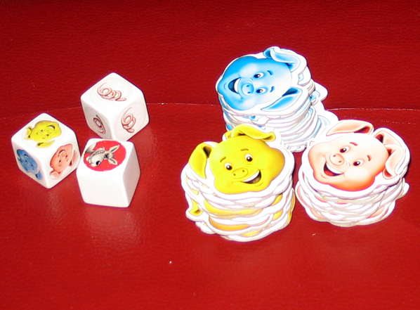 В игре используются 3 кубика - один показывает цвет поросенка, второй (с хвостами) показывает количество поросят и третий - злого серого волка.