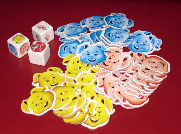 Мы как всегда играем немножко по своему. Во-первых, мы играем до последнего поросёнка в стаде. Не зависимо от цвета, у нас побеждает тот у кого их больше. А во-вторых, так как кубики достаточно крупные и ребёнку трудно бросить их все одновременно, мы кладём их в коробку и с грохотом мешаем их там)) что добавляет детям ещё больше радости))